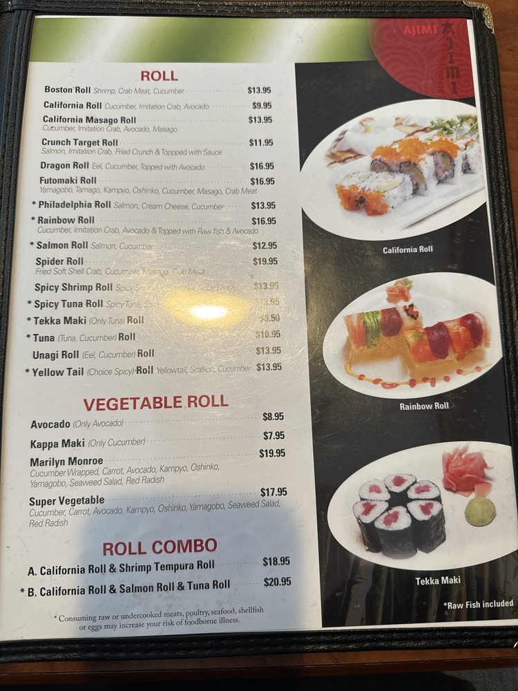 Inside: Salmon, Yellowtail, Cucumber and Crab Meat*Includes raw food item